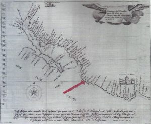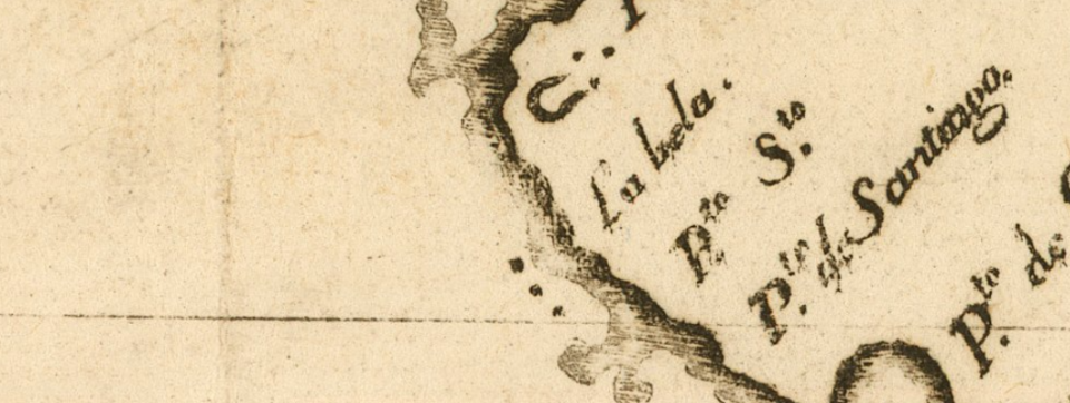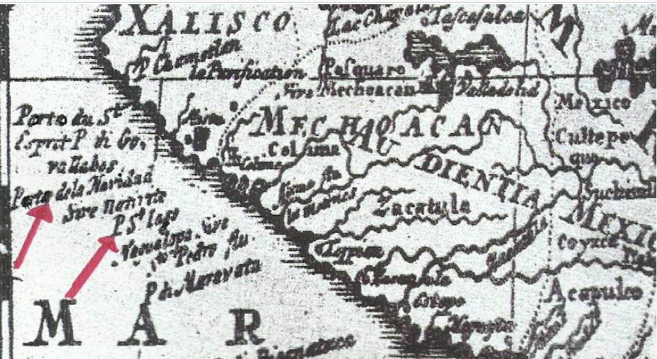 No livro citado, Kelsey refere um mapa da costa da Nova Espanha de 1580, dito mapa de Cavendish, o qual, segundo afirma (tradução do original): “mostra Juan Gallego um porto na costa de Colima alguma distância a norte de Navidad”. (Pág. 102) A afirmação vinculada a Kelsey oferece-me dúvidas, porque os documentos coevos, datados de anos próximos após o descobrimento do porto em 1540, assinalam na costa de Colima dois únicos portos, um é o porto de Navidad, podendo estar registado com outro dos topónimos: Juan Gallego ou Santo, e, o segundo é o porto de Santiago. Confirma-se nomeadamente no mapa de Domingo del Castillo de 1541 que tem registado o porto de Navidad com o topónimo Santo, e a sul deste o porto de Santiago (Fig. 4); no mapa do português António Pereira de 1545 que repete a mesma nomenclatura. Saliento a “Relación Breve y Sumaria de la visita hecha por el Lic. Lorenzo Lebrón de Quiñones, oidor del Nuevo Reino de Galicia por Mandado de Su Alteza”, datada de 1553 do qual se transcreve: “ En esta provincia de Colima hay dos puertos del Mar del Sur, y el uno es el puerto de Navidad, junto a la provincia de Cihuatlán. (…) Hay otro puerto que se llama el de Santiago, está a nueve leguas del de Navidad…” ( 12 ). Mais uma prova: carta geográfica de 1567 da costa de Colima reproduzida do livro “Fray Juan Larios, defensor de los indios y Fundador de Coamnila”, regista o porto de Navidad e, a sul o porto de Santiago, assinalados na figura 5 com setas vermelhas.